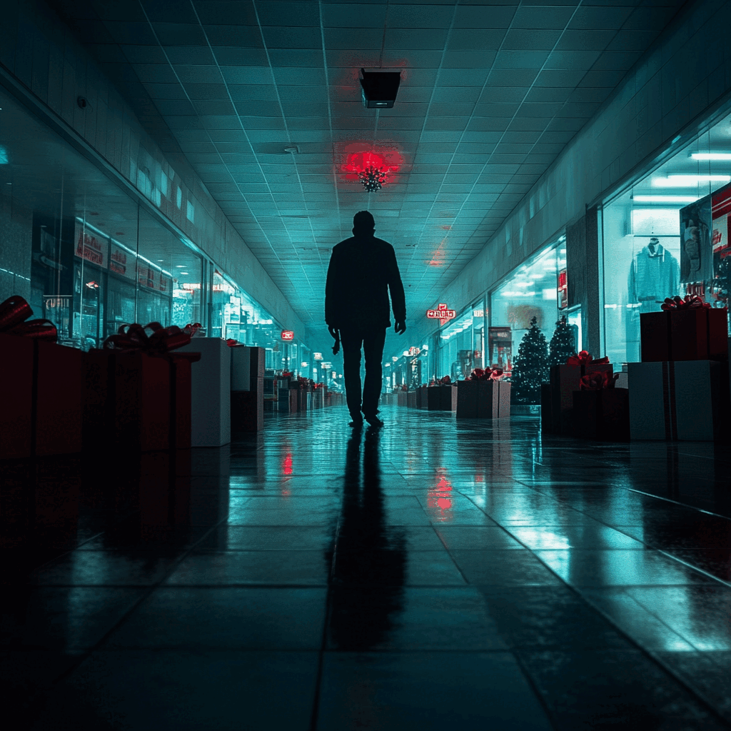 /IMAGINE A guy trapped in a long and eerie mall aisle, full of gift boxes. 90s movie poster.